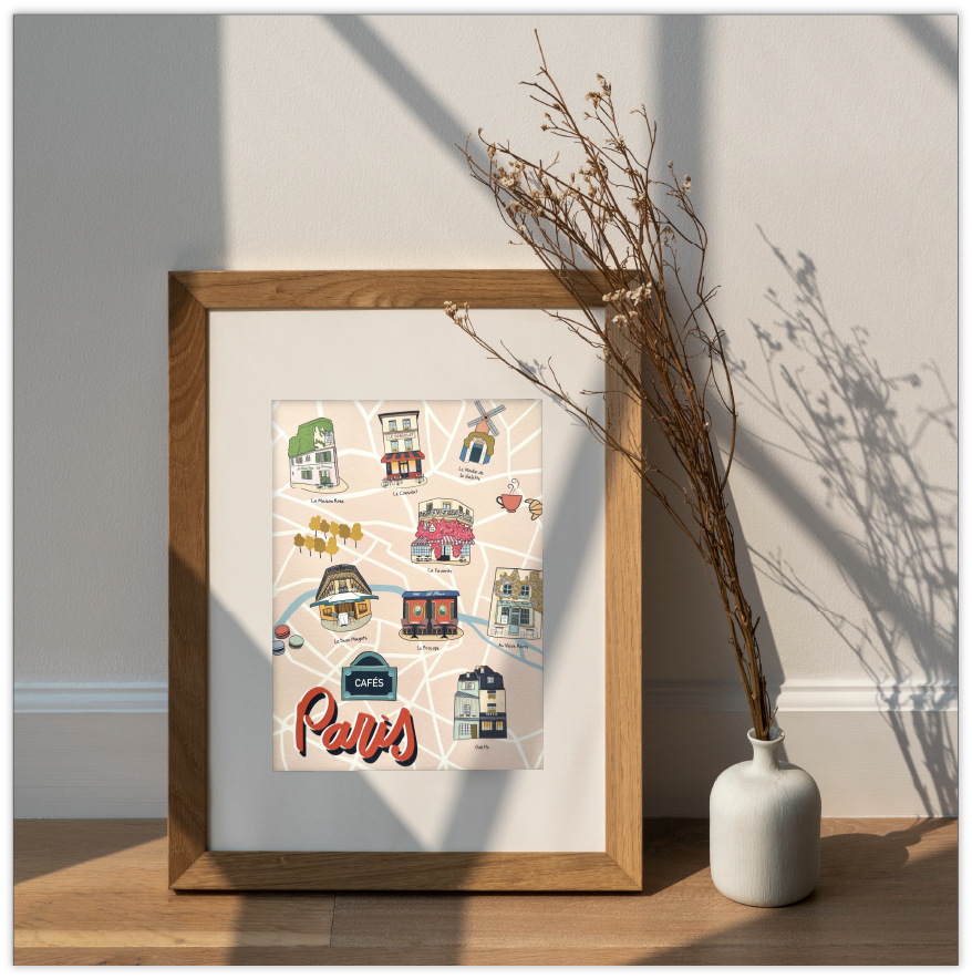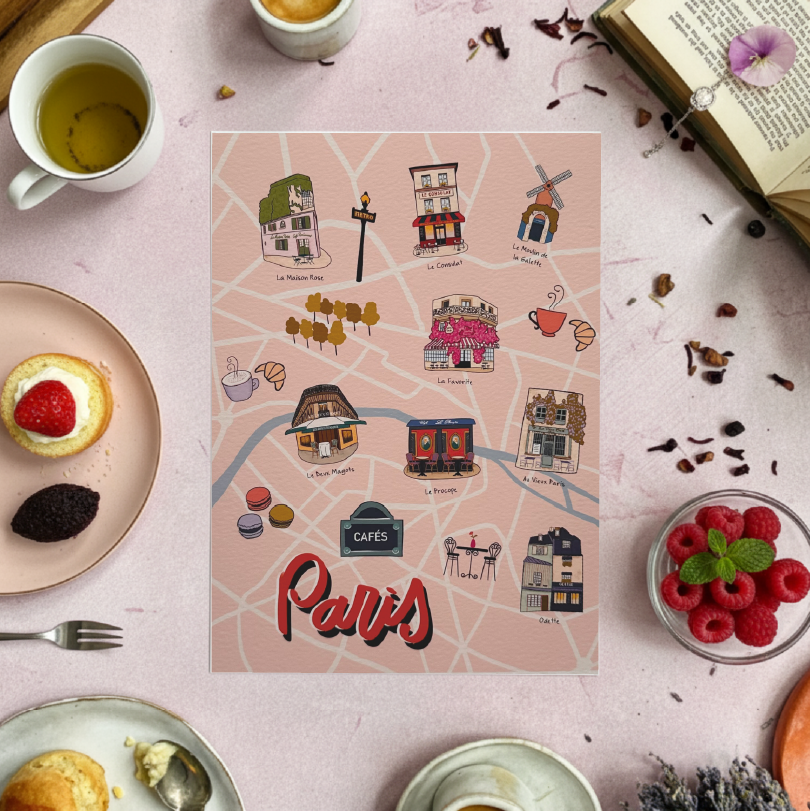 Paris Cafés — Hand-Drawn Map Illustration | Digital Download